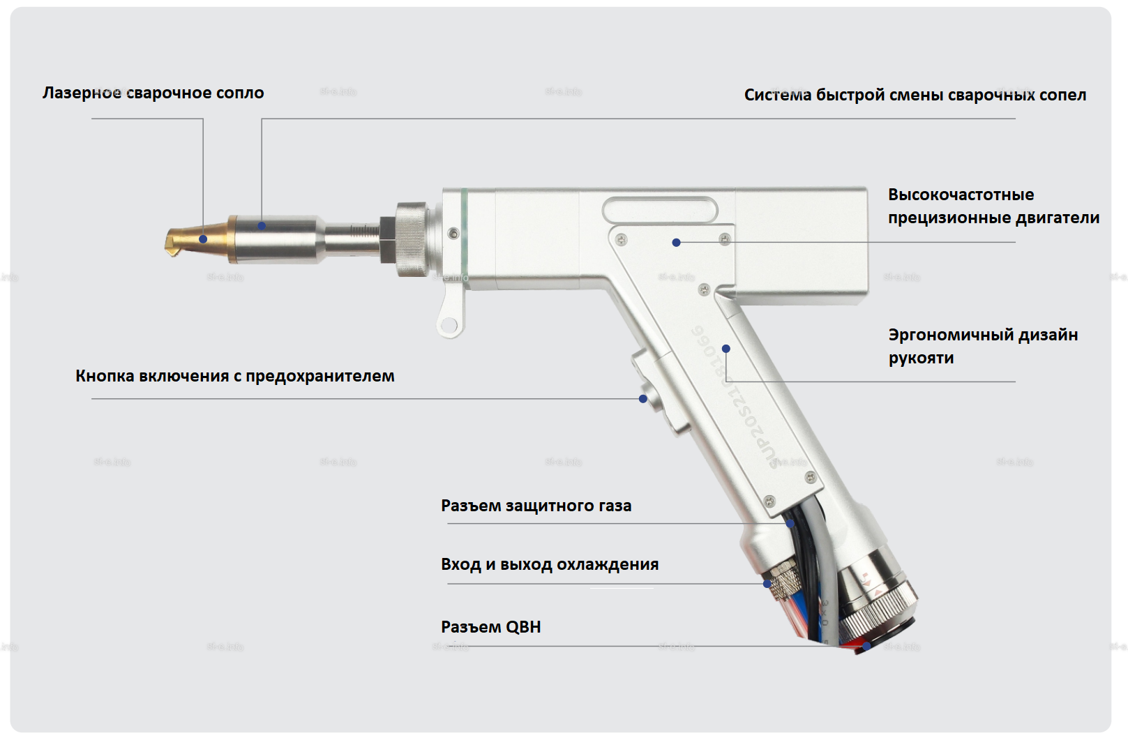 Лазерная головка с возможностью регулировки ширины и типа сварного шва: Используется для фокусировки лазерного луча и контроля параметров сварки, таких как ширина и глубина сварного шва.